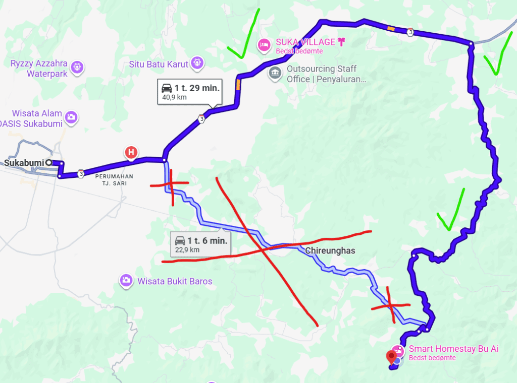 We switched from regular car to XL car on Grab and tried a third driver, and he was more solution oriented. He said that Grab suggested a wrong route, but he could take us on a longer, but better route. We paid for the detour in cash. The better route is from Sukabumi towards Cianjur, turning right on the road “Li. Cianjur – Gn. Padang” when you get to “Indomaret Jambudipa”. This route is about 48 kilometers but much better road. After turning away from the main road, there were still some very large puddles on the road, so we were happy to have a bigger car.