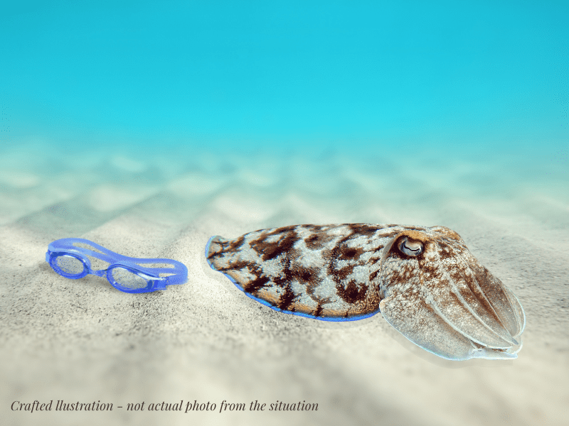 I was so surprised. Not only had we found the goggles against all odds. Also my prayer had been answered and thereby my feeling of the cuttlefish being conscious and willing and able to help had been confirmed. I had not told Christian about asking the sea for guidance and help, but he completely confirmed my experience in the way he told me what happened. I also felt that the cuttlefish wasn’t afraid of us and that it deliberately showed him the goggles.